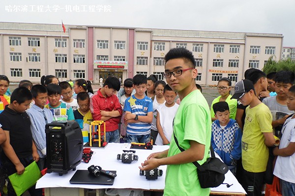 此次机电“科技点亮乡村”社会实践队伍从本专业的基础出发,带来了许多娱乐及服务机器人,讲解员为机电科技部部长张广朋,他深入浅出的讲解让中学生对机器人的结构、分类、应用领域等方面有了大致的理解。学生李晓杰看完机器人表演后兴奋地说:“我想做一个像钢铁侠那样的人,我一定要好好学习,将来设计自己的机器人。”