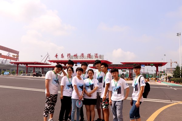 10时,实践队全员抵达跨海大桥。实践队员们欣赏了壮丽的海景,在桥上观看了部分在建桥体的施工过程以及已完工通车的海上立交桥。青岛跨海大桥横跨胶州湾,将青岛东、西两个主要城区连接起来,横跨胶州湾海域全长约35.4公里。